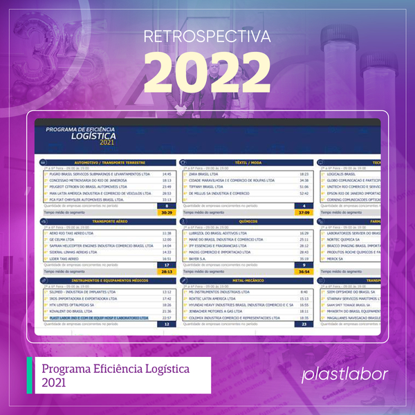 A Plastlabor ficou entre as cinco melhores empresas no “Programa de Eficiência Logística do aeroporto RIOgaleão Cargo – 2021”. Essa premiação está relacionada com a performance de importadores que demonstram agilidade no trâmite para retirada de cargas do terminal.