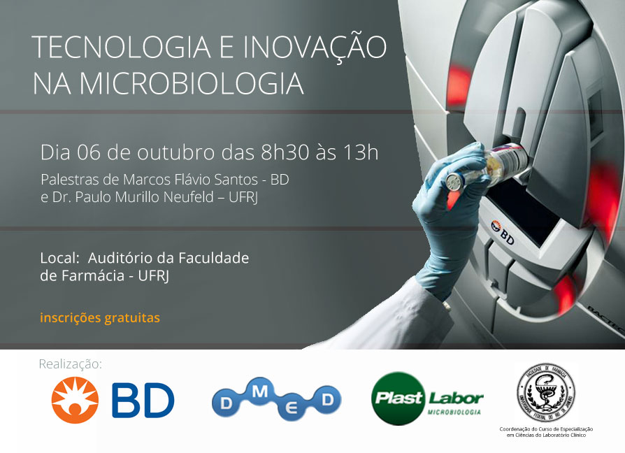A Plastlabor e a Dmed, em parceria com a BD e apoio da Faculdade de Farmácias – UFRJ, promovem o evento gratuito: Tecnologia e Inovação na Microbiologia. Com palestras de Marcos Flávio Santos sobre Automação Clinica de Hemoculturas Aeróbias e Anaeróbias e a Identificação Microbiana Automatizada; e do Dr. Paulo Murillo Neufeld – UFRJ sobre Identificação de fungos de importância médica e forense.
