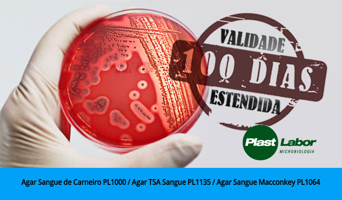 A Plast Labor vem comunicar a extensão da validade para 100 dias dos produtos Agar Sangue de Carneiro PL1000, Agar Sangue Macconkey PL1064 e Agar TSA Sangue PL1135.